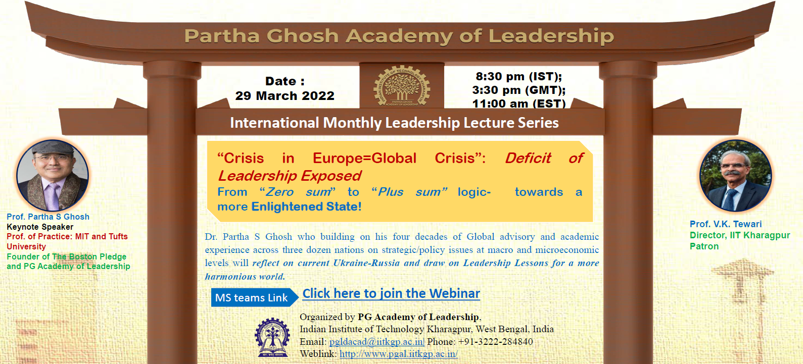 March 29, 2022: IITKGP's Partha Ghosh Academy of Leadership Keynote talk on "Europe Crisis=Global Crisis: Deficit of Leadership Exposed"